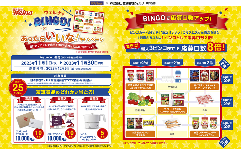 東武ストア全店舗で販売している日清製粉ウェルナ家庭用商品(常温・冷凍商品)を1品以上含む、1,000円(税込)以上のお買上げレシート(コピー不可)を専用応募はがきもしくは郵便はがきに貼り、必要事項(郵便番号・ご住所・お名前・フリガナ・電話番号・ビンゴの数・郵便はがきの場合は購入した店舗名)を明記の上、切手を貼ってご郵送ください。