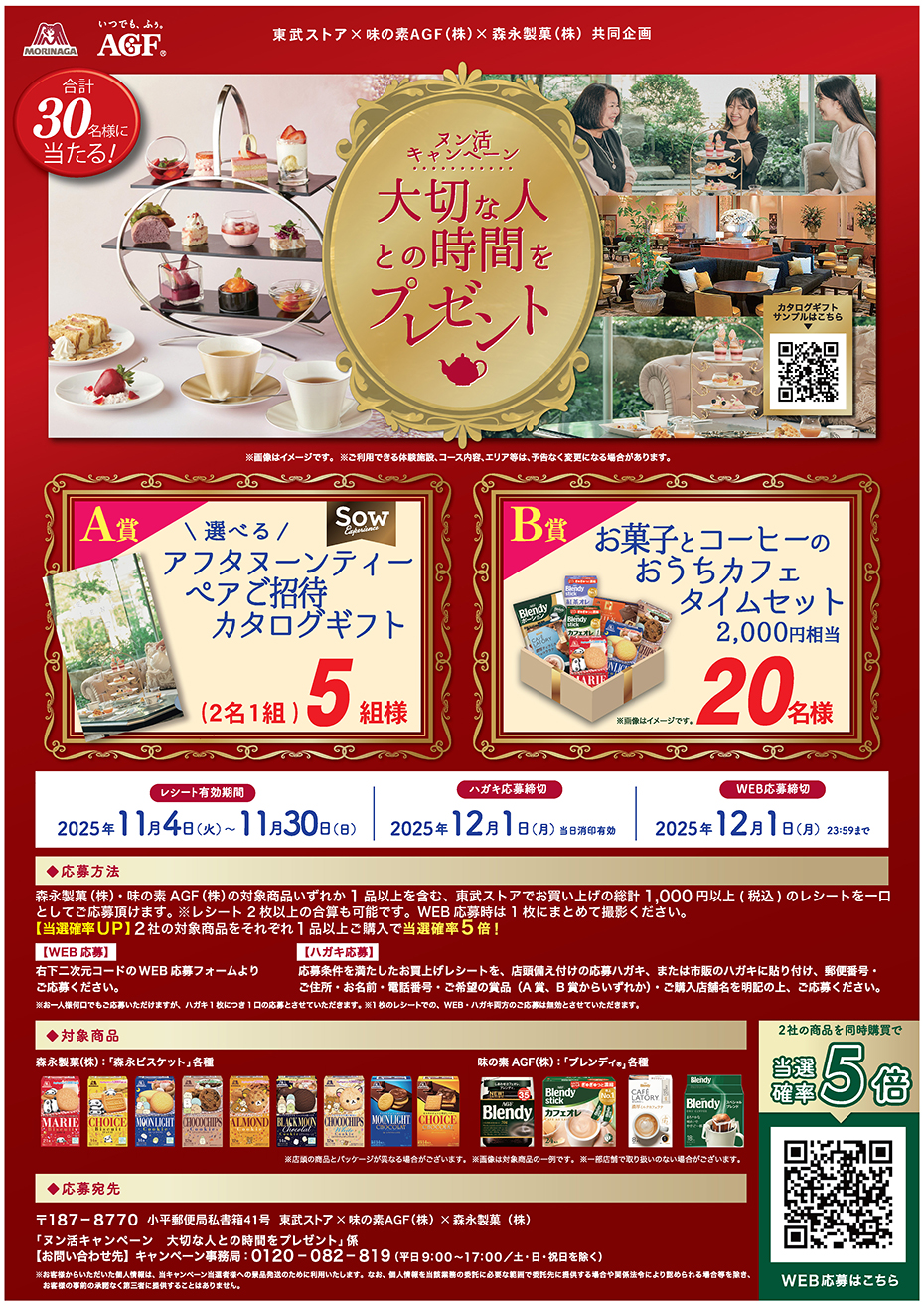 森永製菓・味の素AGF(株)の対象商品いずれか1品以上を含む、東武ストアでお買い上げの総計1,000円以上(税込)のレシートを一口としてご応募頂けます。(レシート2枚以上の合算も可能です。WEB応募時は1枚にまとめて撮影ください。)