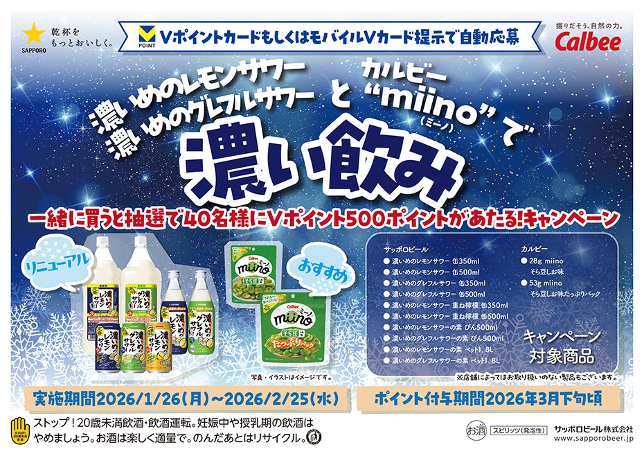 VポイントカードもしくはモバイルVカードを提示して、対象の濃いめのレモンサワー・濃いめのグレフルサワーと対象のカルビーmiinoを各1点(計2点)をセットで購入すると抽選で40名様にVポイント500ポイントが当たります!