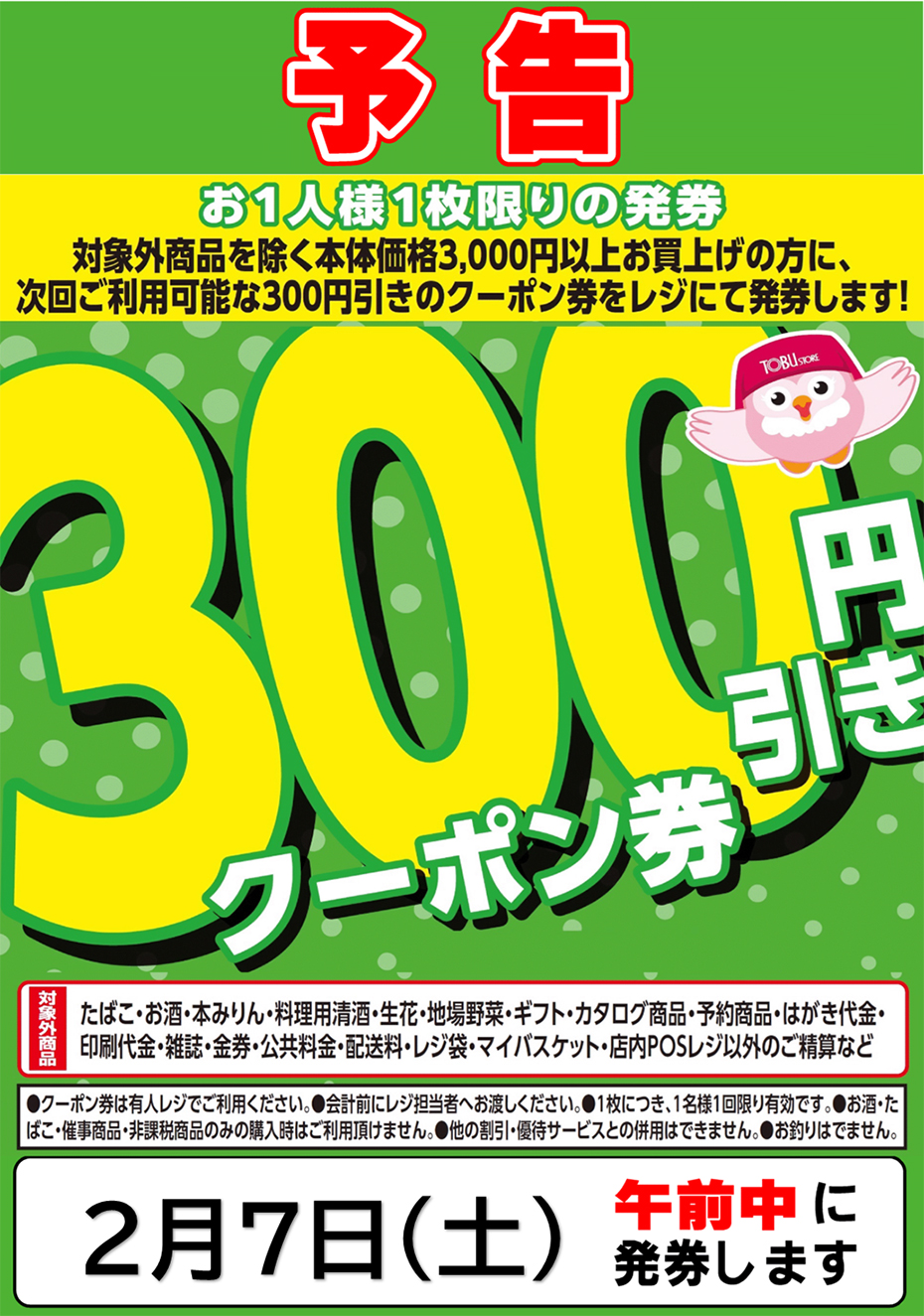 2月7日(土)午前中に対象外商品を除く本体価格3,000円以上お買上げの方に次回ご利用可能な「300円引きのクーポン券」をレジにて発券します。