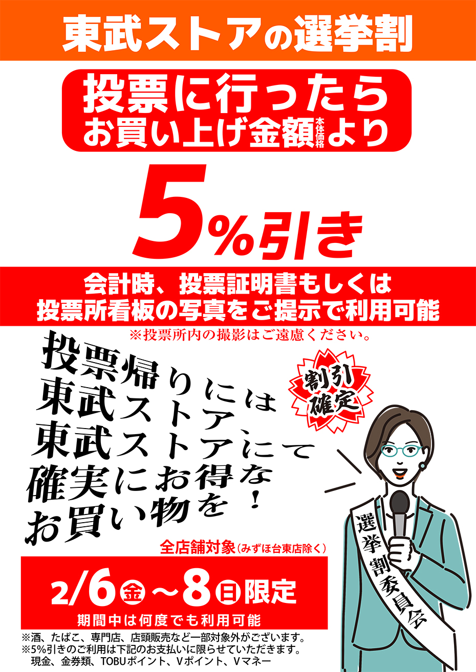 2月6日(金)~8日(日) 投票に行ったらお買い上げ金額(本体価格)より5%引き!