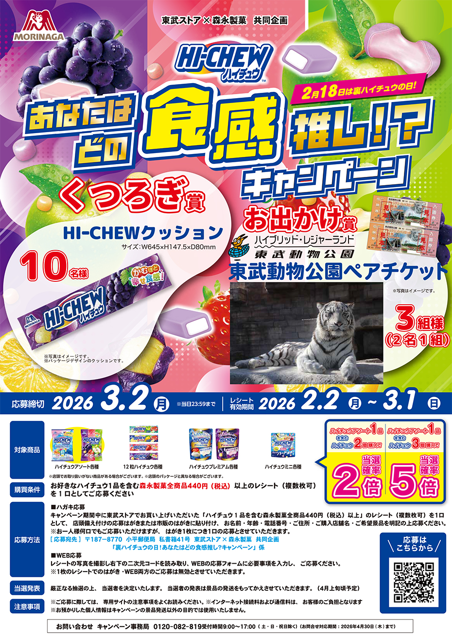 キャンペーン期間中に東武ストアでお買い上げいただいた「ハイチュウ1品を含む森永製菓全商品440円(税込)以上」のレシート(複数枚可)を1口として、店頭備え付けの応募はがきまたは市販のはがきに貼り付け、郵便番号・ご住所・お名前・年齢・電話番号・ご購入店舗名・ご希望景品を明記の上、ご応募ください。