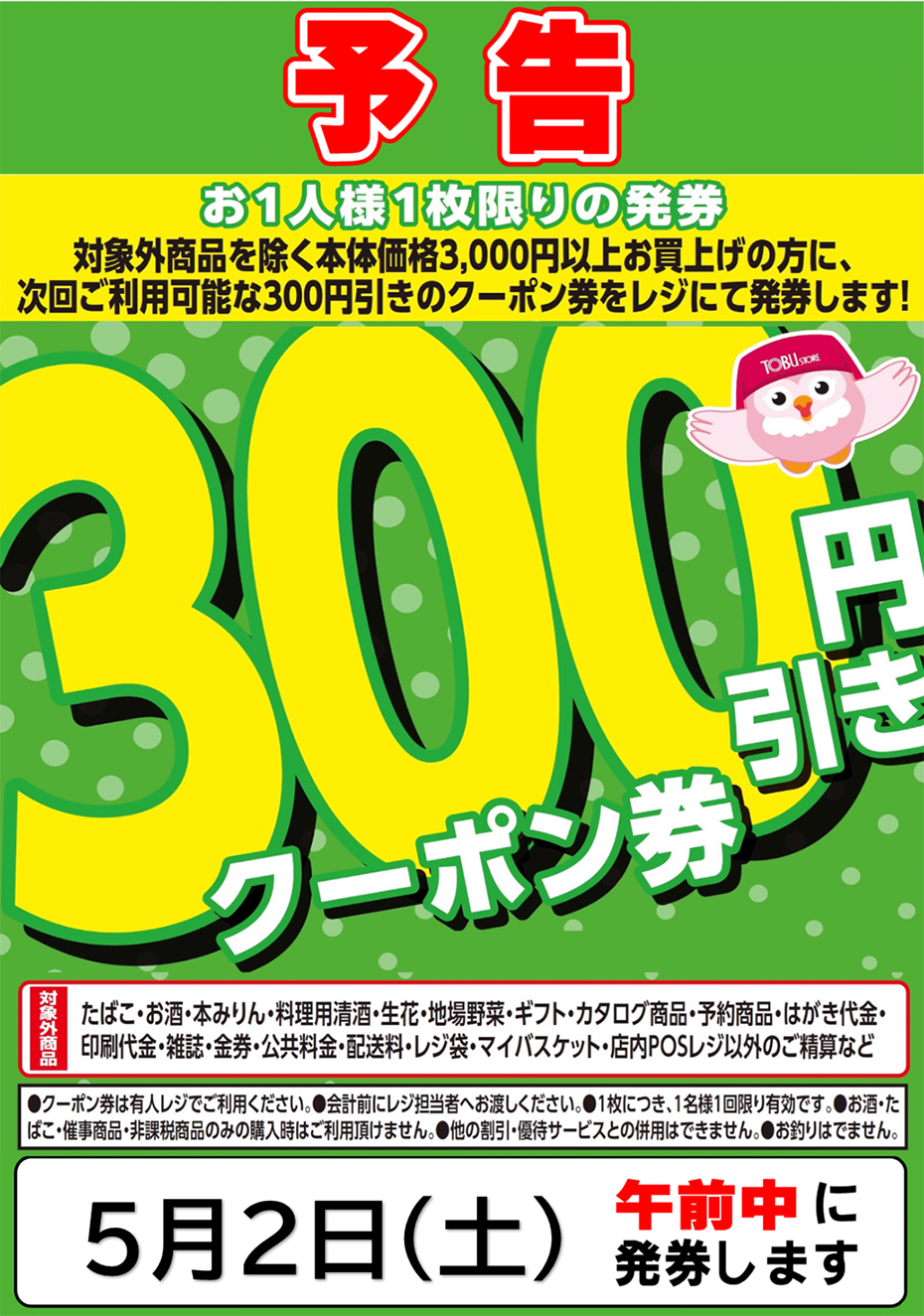 5月2日(土)午前中に対象外商品を除く本体価格3,000円以上お買上げの方に次回ご利用可能な「300円引きのクーポン券」をレジにて発券します。